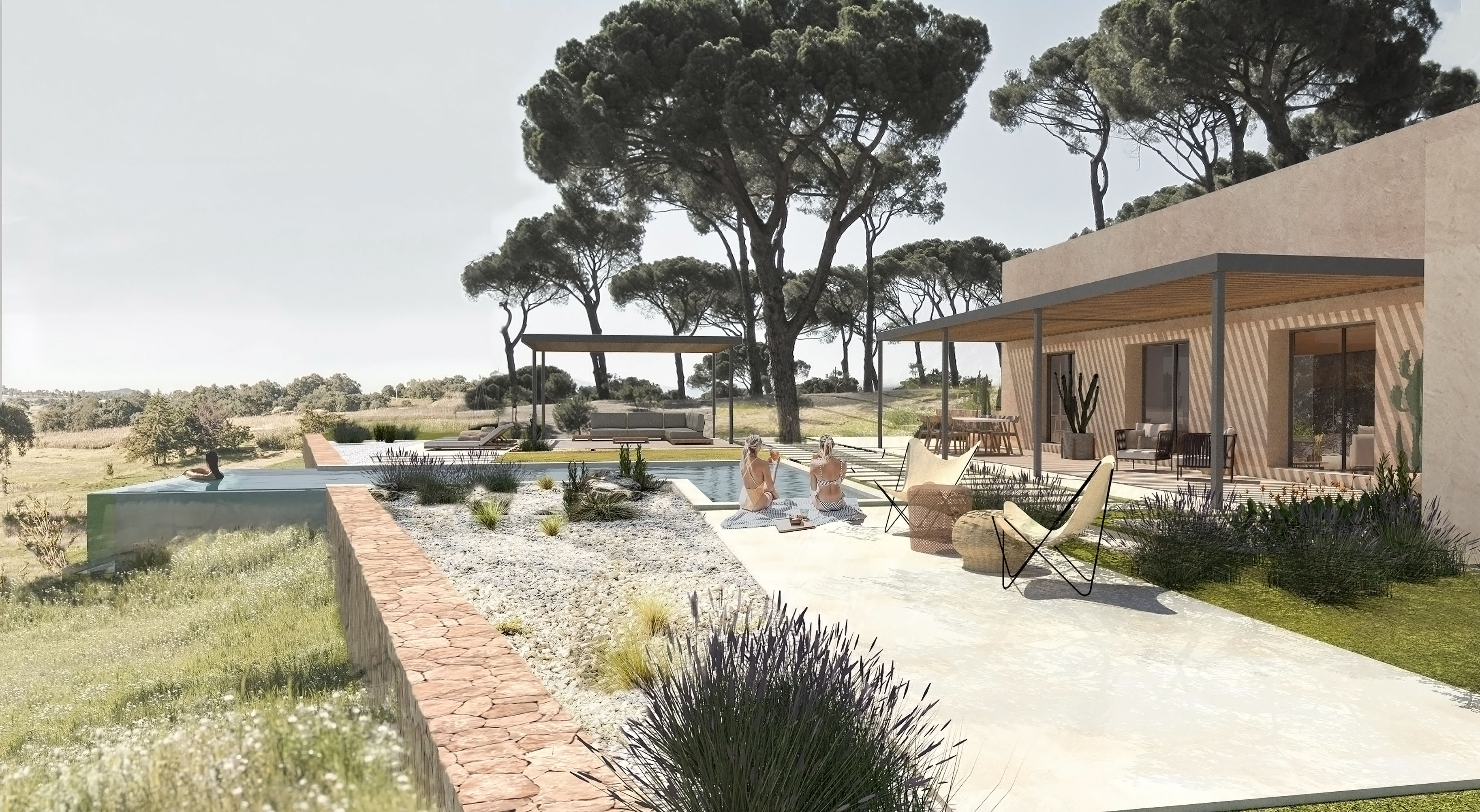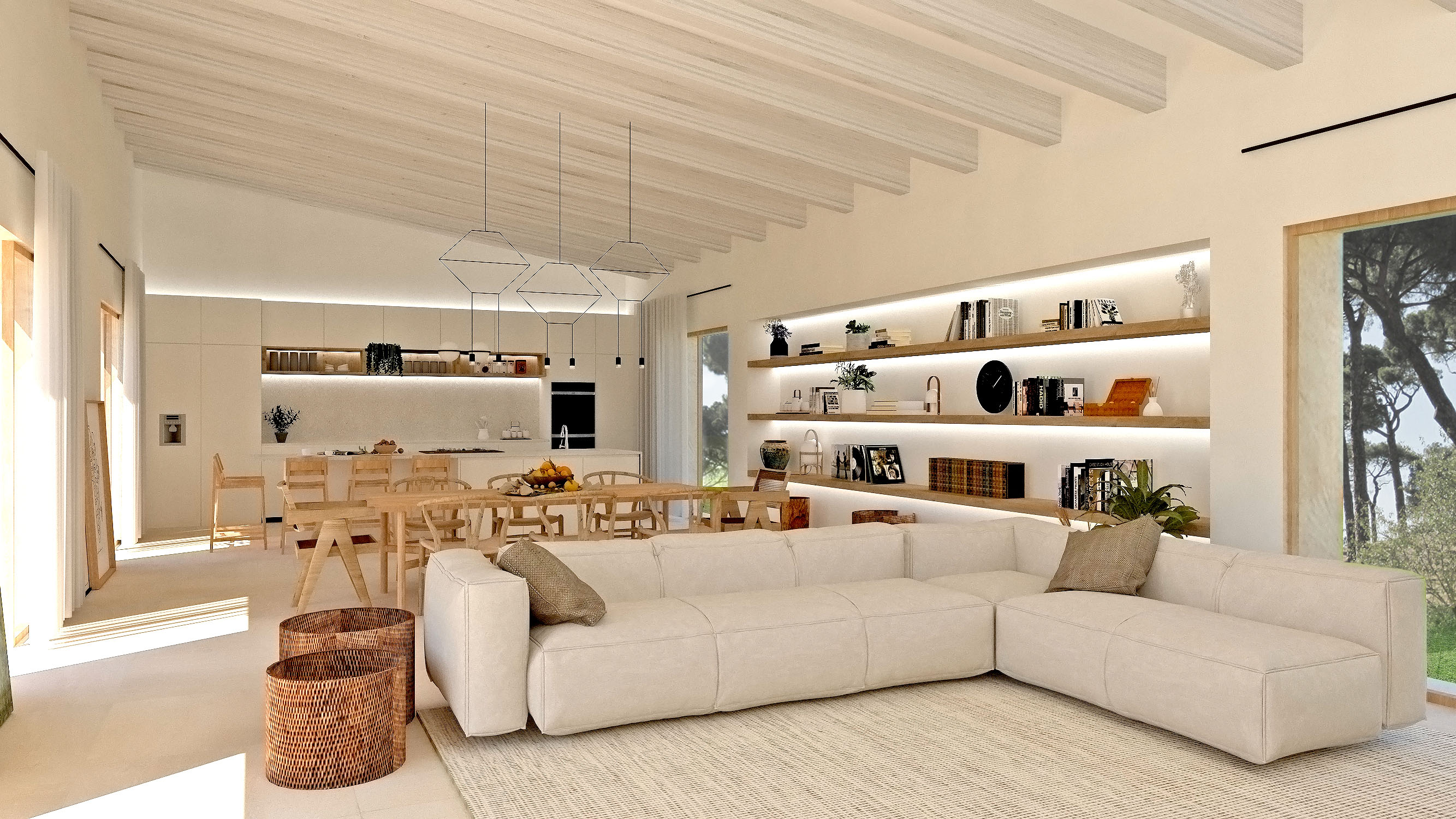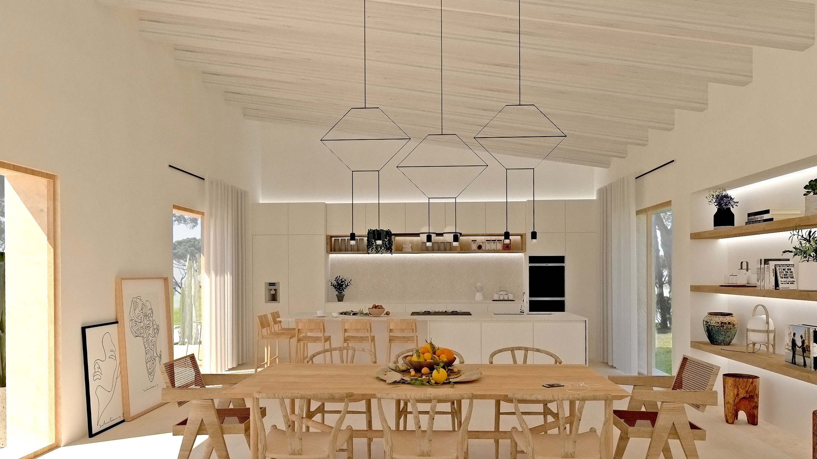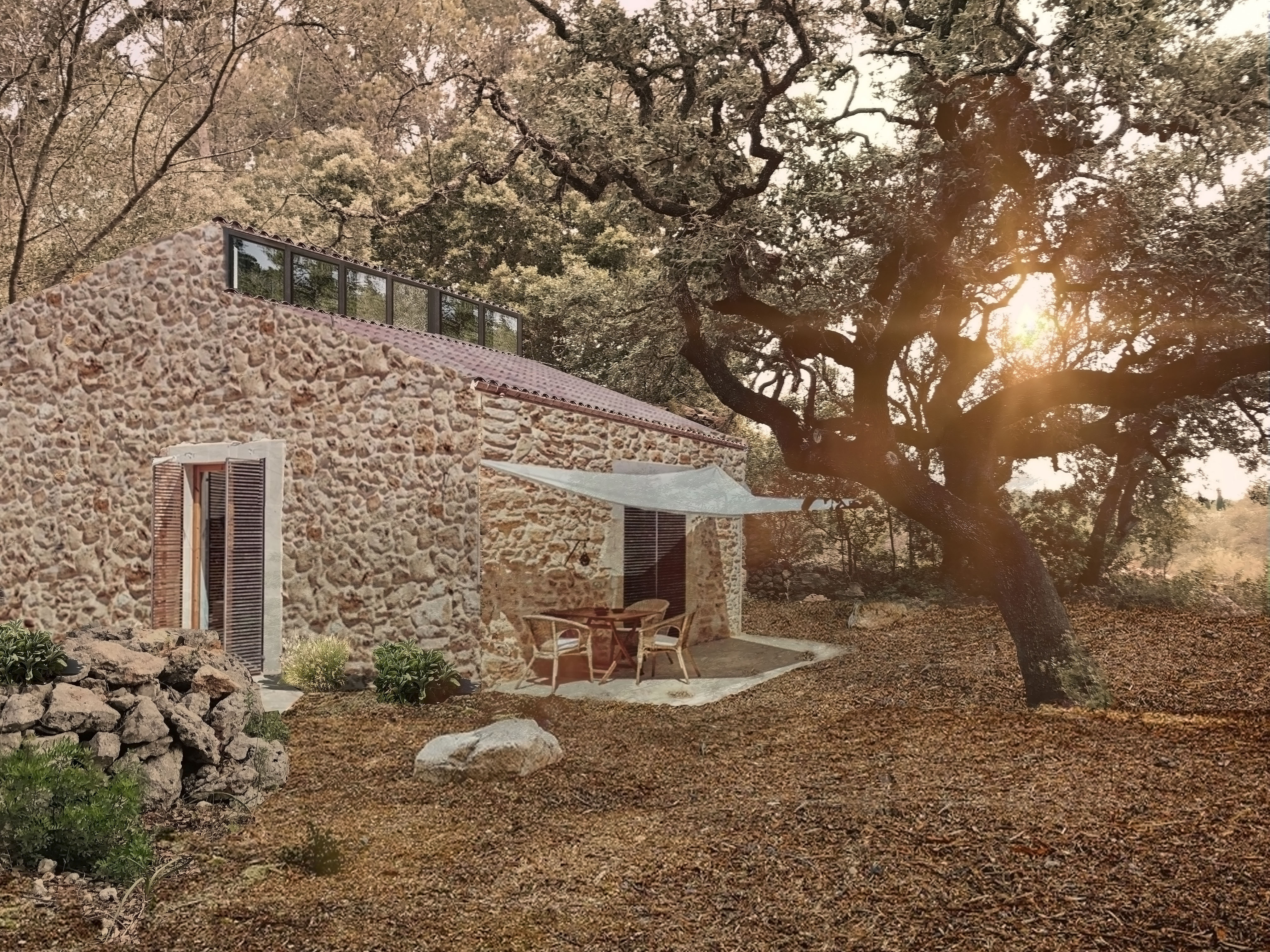 S´alzina es un proyecto en el espléndido campo mallorquín situado en el centro de la isla. En éste se encuentra una ruina de una antigua casa de aperos en un magnífico bosque de encinas, de allí el origen del nombre del proyecto. La parcela tiene forma rectangular y consta de dos franjas, una norte con un pinar y una sur totalmente despejada. La casa se sitúa entre esas dos zonas para proporcionarle cobijo del viento del norte, mientras que por el otro lado se abre para buscar la luz natural del sur y aprovechar las despejadas vistas hacia una zona natural protegida. El proyecto busca la máxima integración con el entorno natural, por eso se encuentra bajo los inmensos pinos, buscando también la máxima eficiencia energética, a través de una ventilación natural gracias a su fachada sur. Las cubiertas son inclinadas, además de ser de teja tradicional, de esta forma la casa se protege del sol, sobre todo en los meses de verano y se consigue evitar así, también, el sobrecalentamiento de la casa. Las grandes ventanas se protegen también con porches y vegetación natural de hoja caduca, permitiendo el paso de luz en invierno y proporcionando una agradable y fresca sombra en verano. La casa está proyectada con materiales de la isla, de construcción típica como la madera, piedra y revocos naturales. El resultado es aparentemente una sencilla casa escondida entre el paisaje, pero es el fruto de una profunda reflexión que respeta su entorno, integrándolo como parte de la casa y pensada para disfrutar y sacar partido a todas sus características naturales, dando lugar a un espacio luminoso y rodeado de unas maravillosas vistas.