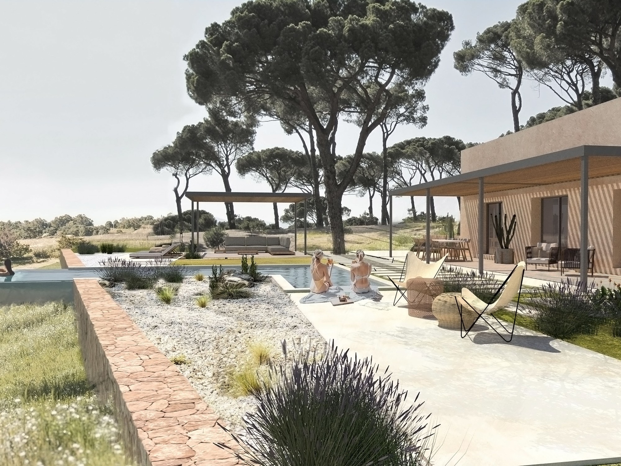S´alzina es un proyecto en el espléndido campo mallorquín situado en el centro de la isla. En éste se encuentra una ruina de una antigua casa de aperos en un magnífico bosque de encinas, de allí el origen del nombre del proyecto. La parcela tiene forma rectangular y consta de dos franjas, una norte con un pinar y una sur totalmente despejada. La casa se sitúa entre esas dos zonas para proporcionarle cobijo del viento del norte, mientras que por el otro lado se abre para buscar la luz natural del sur y aprovechar las despejadas vistas hacia una zona natural protegida. El proyecto busca la máxima integración con el entorno natural, por eso se encuentra bajo los inmensos pinos, buscando también la máxima eficiencia energética, a través de una ventilación natural gracias a su fachada sur. Las cubiertas son inclinadas, además de ser de teja tradicional, de esta forma la casa se protege del sol, sobre todo en los meses de verano y se consigue evitar así, también, el sobrecalentamiento de la casa. Las grandes ventanas se protegen también con porches y vegetación natural de hoja caduca, permitiendo el paso de luz en invierno y proporcionando una agradable y fresca sombra en verano. La casa está proyectada con materiales de la isla, de construcción típica como la madera, piedra y revocos naturales. El resultado es aparentemente una sencilla casa escondida entre el paisaje, pero es el fruto de una profunda reflexión que respeta su entorno, integrándolo como parte de la casa y pensada para disfrutar y sacar partido a todas sus características naturales, dando lugar a un espacio luminoso y rodeado de unas maravillosas vistas.